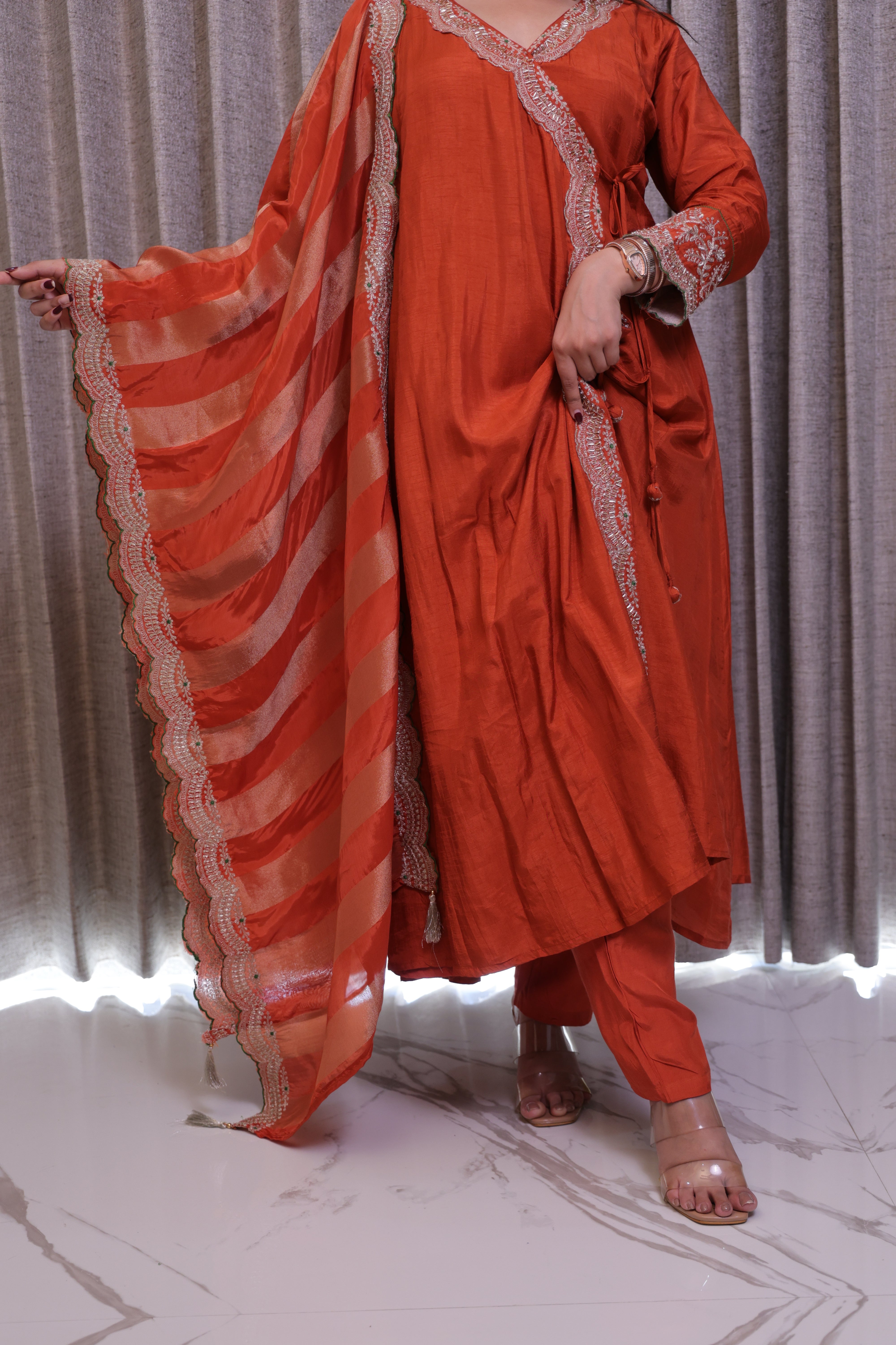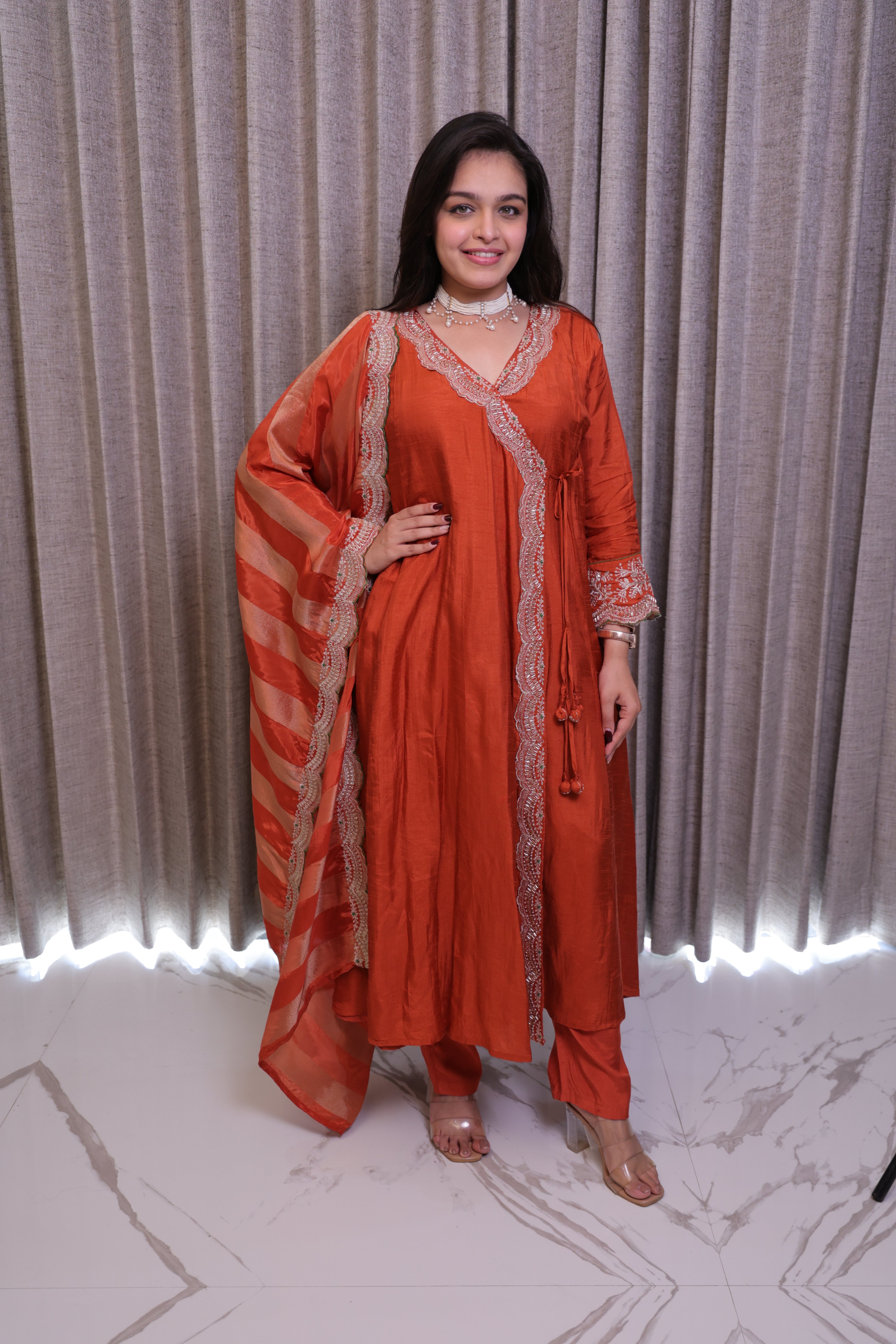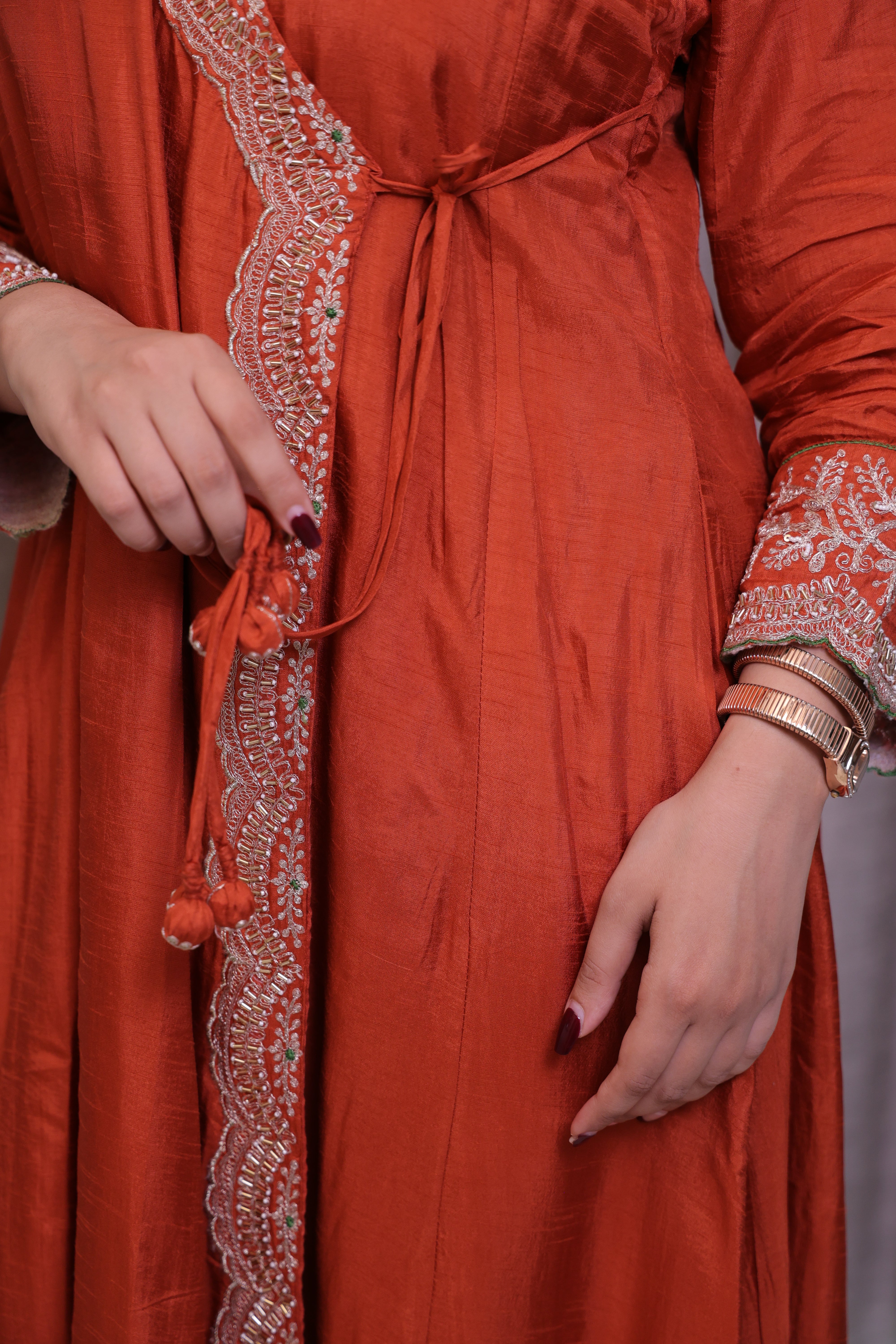 Make a graceful statement with this elegant rust-colored heavy kurta set crafted in premium Silk fabric. The kurta features a wrap-style V-neckline enhanced with intricate embellishment and delicate lace border detailing, giving it a rich and festive appeal. Tassel tie-up accents add a traditional touch, while the flowy silhouette ensures all-day comfort.